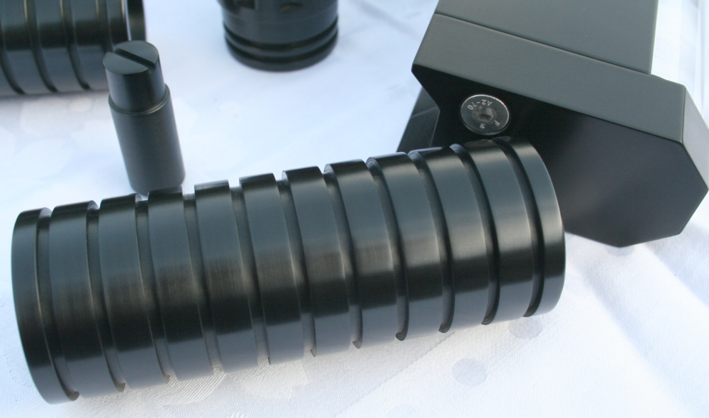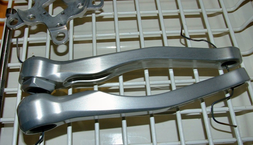 Die Teile wurden vorher mit Natronlauge entschichtet (die Reste der ursprünglichen violetten Eloxierung sieht man auf dem ersten Bild noch). Dieses Beizen sorgt für eine sehr ebene Oberfläche. (Tipp: das doppelte Anodisieren mit zwischenzeitlicher Entschichtung ist ein einfacher Trick, um blankere Oberflächen zu erzielen.)