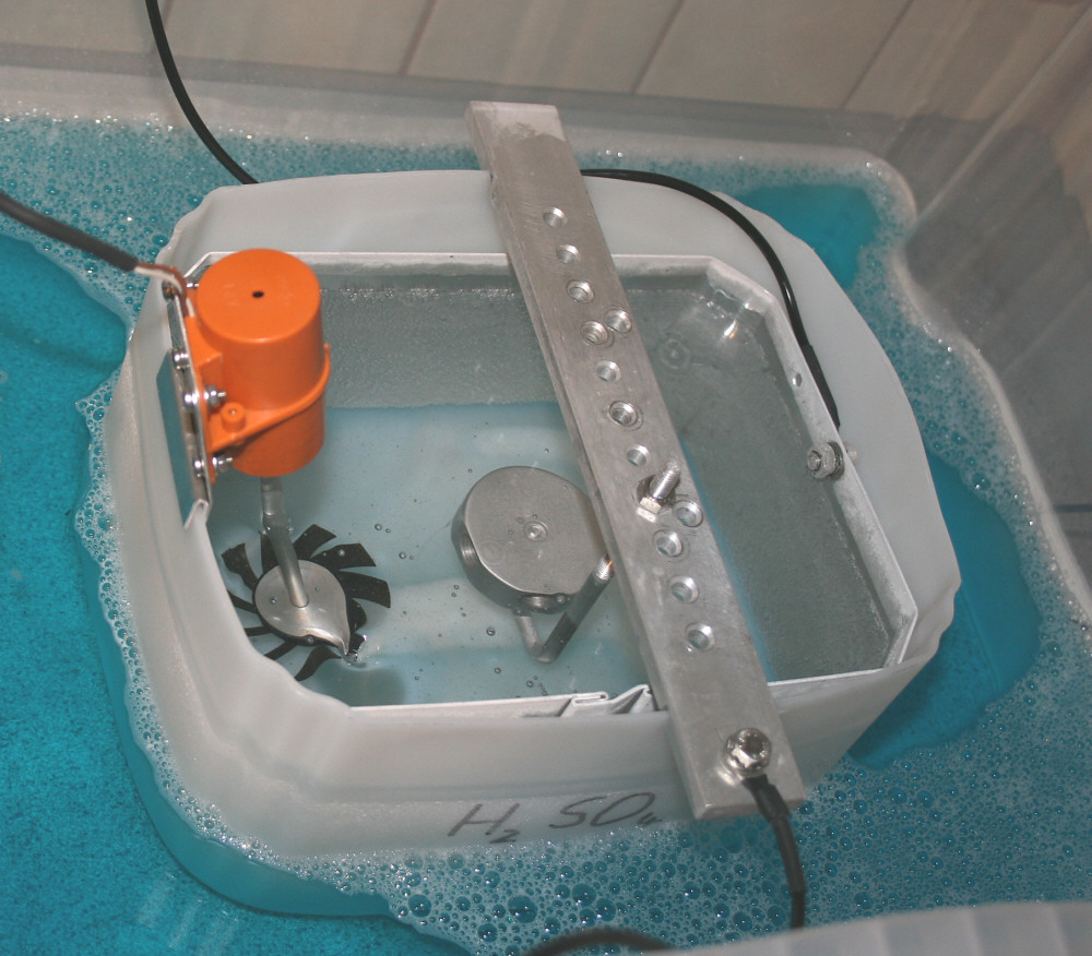 Der unverdünnte Scheibenfrostschutz und auch die Schwefelsäure werden im Gefrierschrank auf -15 bis -20 Grad heruntergekühlt. So brauchte ich bis jetzt noch keine aktive Kühlung und die Badtemperatur stieg nach 90 min. maximal auf +11 Grad.