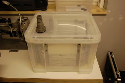 Nun zum Vorgang selbst. Anodisiert wird in einem halben Kunststoffkanister. Die Kathode ist ringförmig aus Al99,5 Blech.