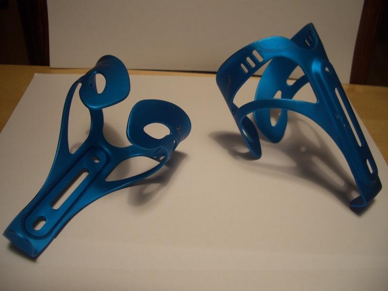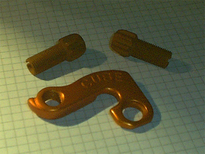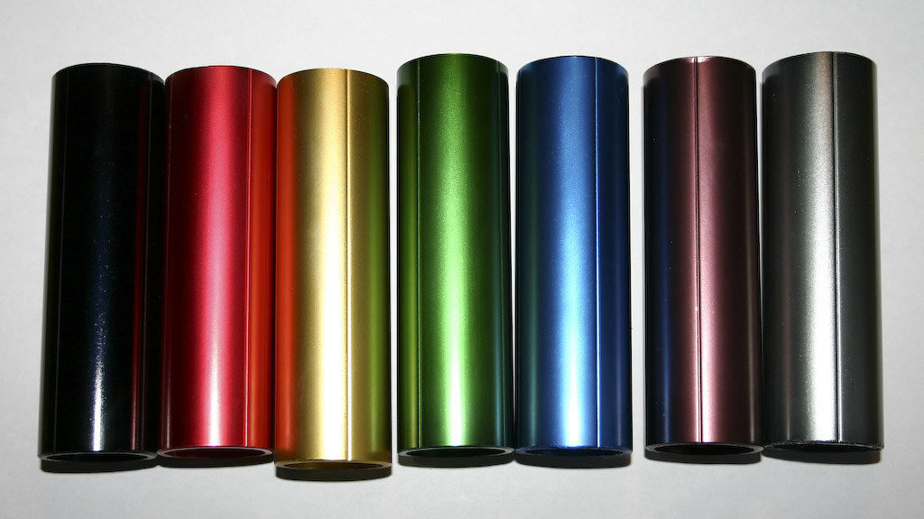 Nächstes Mal mit warmer Farblösung arbeiten (die wurde immer wieder kalt zwischendurch) und größere Gefäße (!), s. Sattelstütze (da sieht man rel. gut, dass sie 2 x halb/halb eloxiert und gefärbt wurde - kann man ja wieder). Die Teile habe ich im Durchschnitt ca. 25-30 mins hängen gehabt, die kleineren entsprechend kürzer.