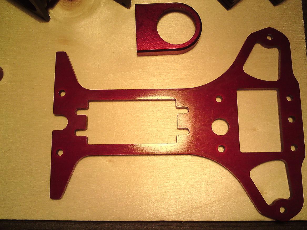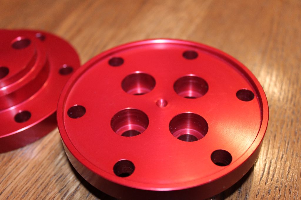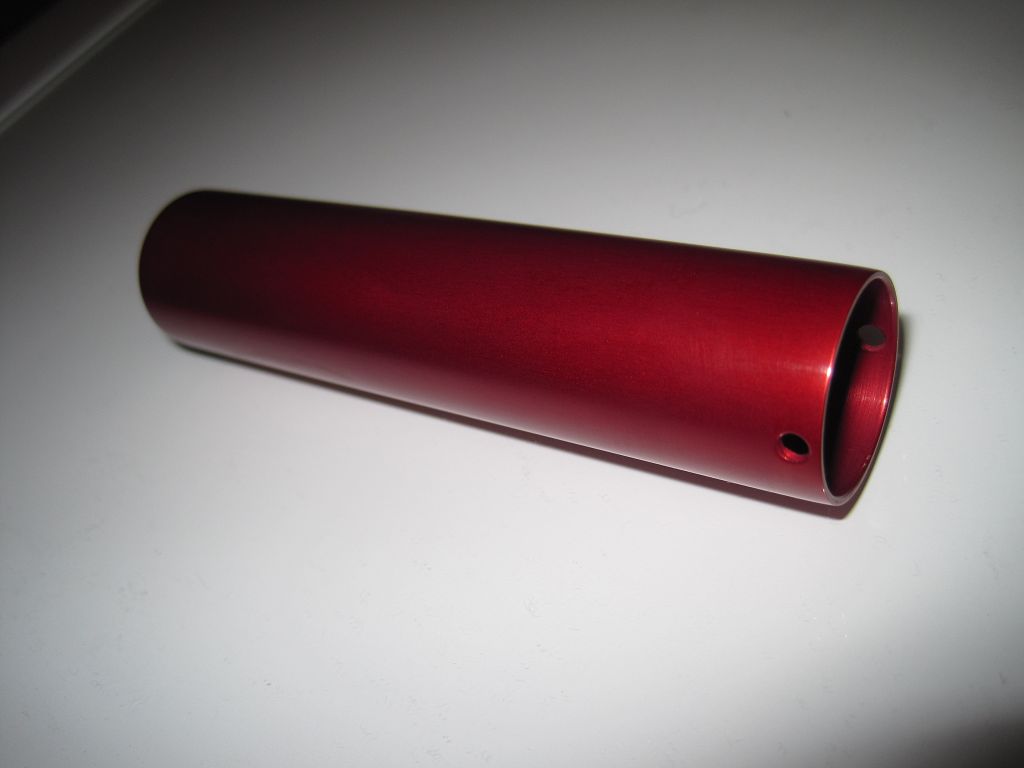 Abgebeizt mit 140g/L Natriumhydroxid, 90min anodisiert, Farbbad rot 10min, schwarz 20min, 1-Stufen Sealing mit Sealsalz.