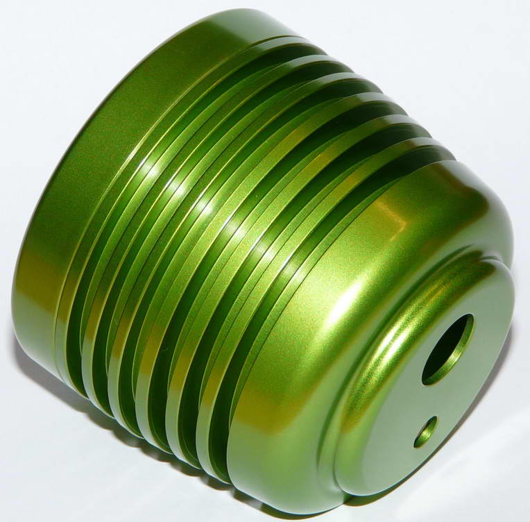 Durch das Eloxieren hat er einen sehr feinen fast perlmuttartigen schimmer erhalten.