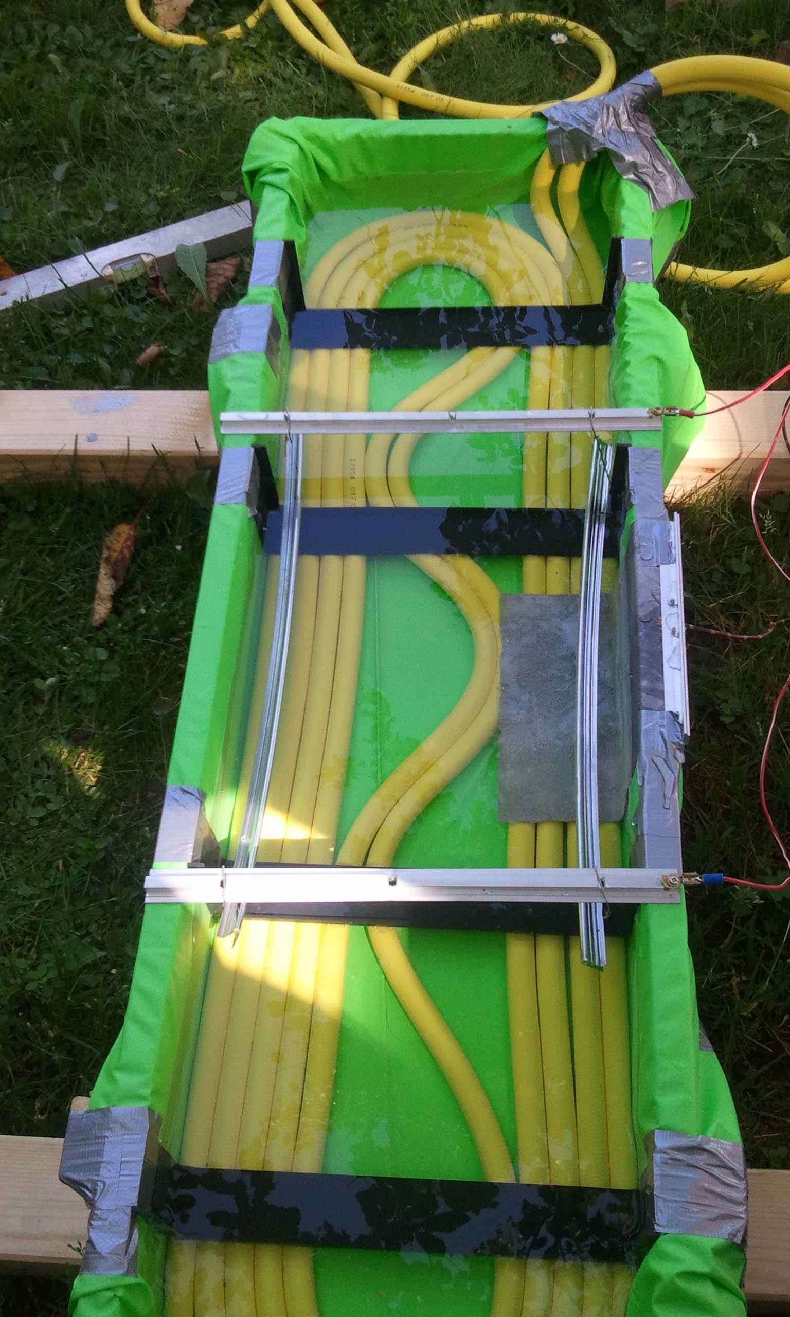 Ein neuer Gedanke wäre tatsächlich das ganze Becken aus Aluplatten zu schweißen und die Säure dann abzulassen. Ich habe versuchsweise einmal ein paar Aluplattenresten im Säurebad für drei Tage liegen lassen und finde nicht dass die Platten allzusehr angegriffen bzw. sogar Löcher hätten. Also denke ich, dass wenn ein paar Tropfen im Becken zurückbleiben die Behälter das durchaus überleben. (Natürlich würde ich dennoch z.B. mit Teichfolie eine zweite Ausenhülle machen).