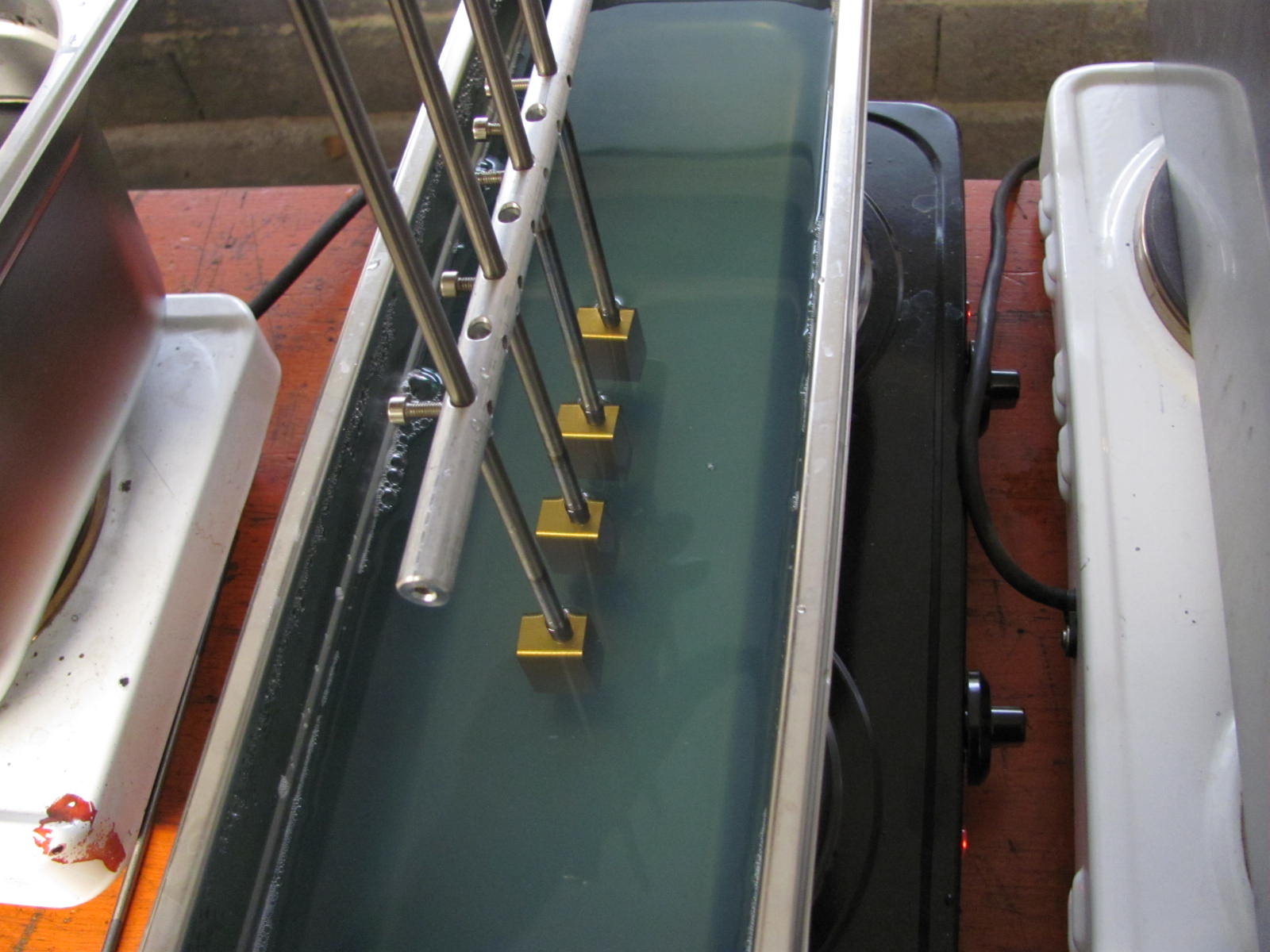 Ich persönlich kontaktiere alle Werkstücke per Gewinde an Titanstäben (3-5 mm Durchmesser), die in einer Alubrücke oberhalb des Bades mittels Schraubklemmung befestigt werden. Ein Stab mit 3mm Durchmesser und einer Eintauchtiefe von 5cm bringt durch seine Oberfläche von 4,71 cm² einen Zusatzstrom von 0,07 A, im Allgemeinen vernachlässigbar, zumindest bei den meisten Werkstücken.