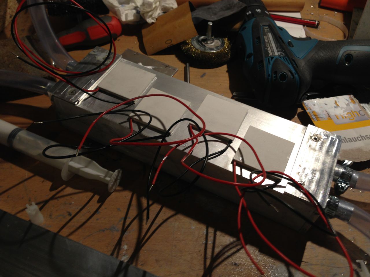Das Funktionsprinzip meines Kühlers ist so: Die Säure fließt durch die Aluprofile. Die Unterseite der Peltierelmente kühlt die Aluprofile bis deutlich unter Raumtemperatur runter, was zur Folge hat, dass der Säure Wärme entzogen wird. Diese Wärme äußert sich auf der anderen Seite des Peltier- Elements. Sie muss durch die anderen 2 Profile aktiv mit Lüftern abgeleitet werden. Hoffentlich reicht das bei mir, aber man kann ja immer noch Elemente deaktivieren oder stärke Kühler drauf bauen. Hier das Video zum Test auf Dichtheit: VIDEO