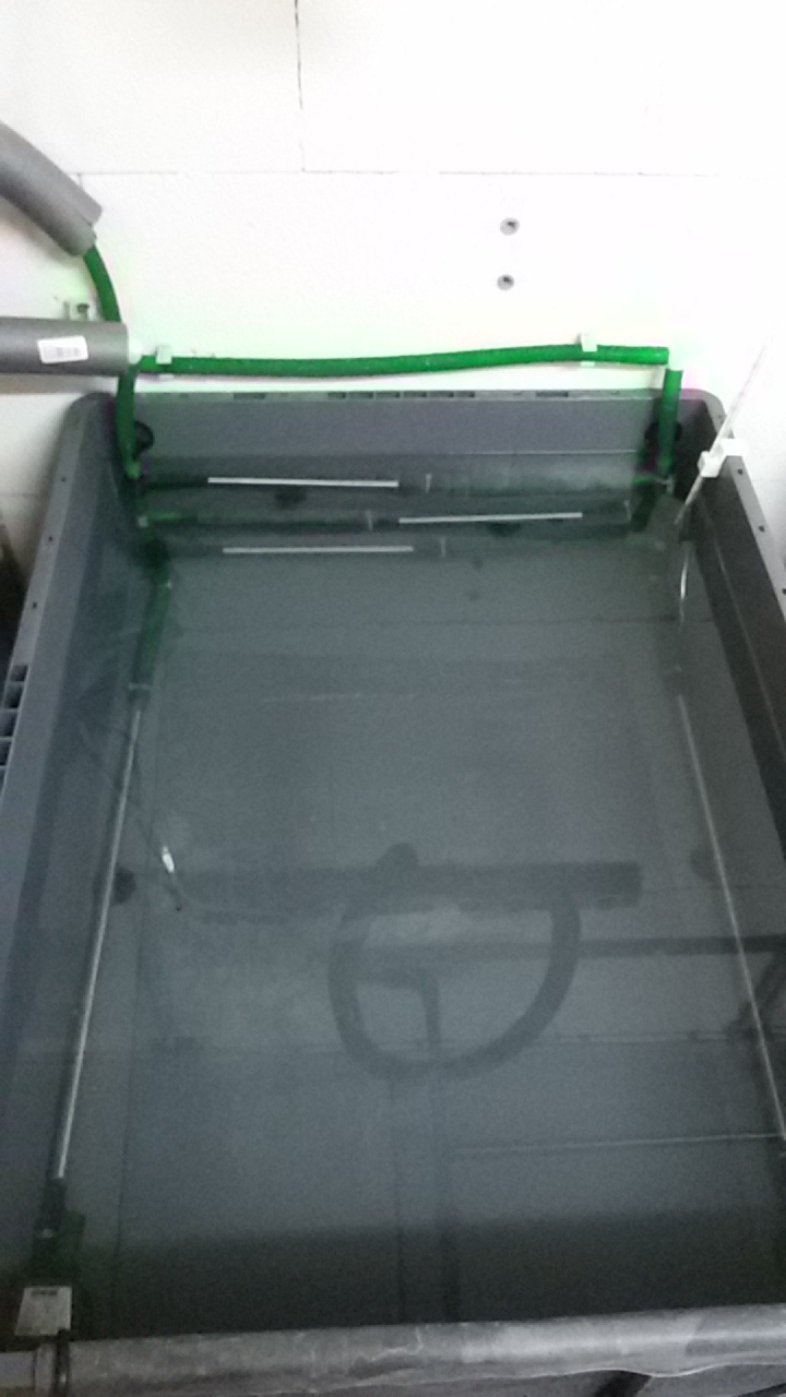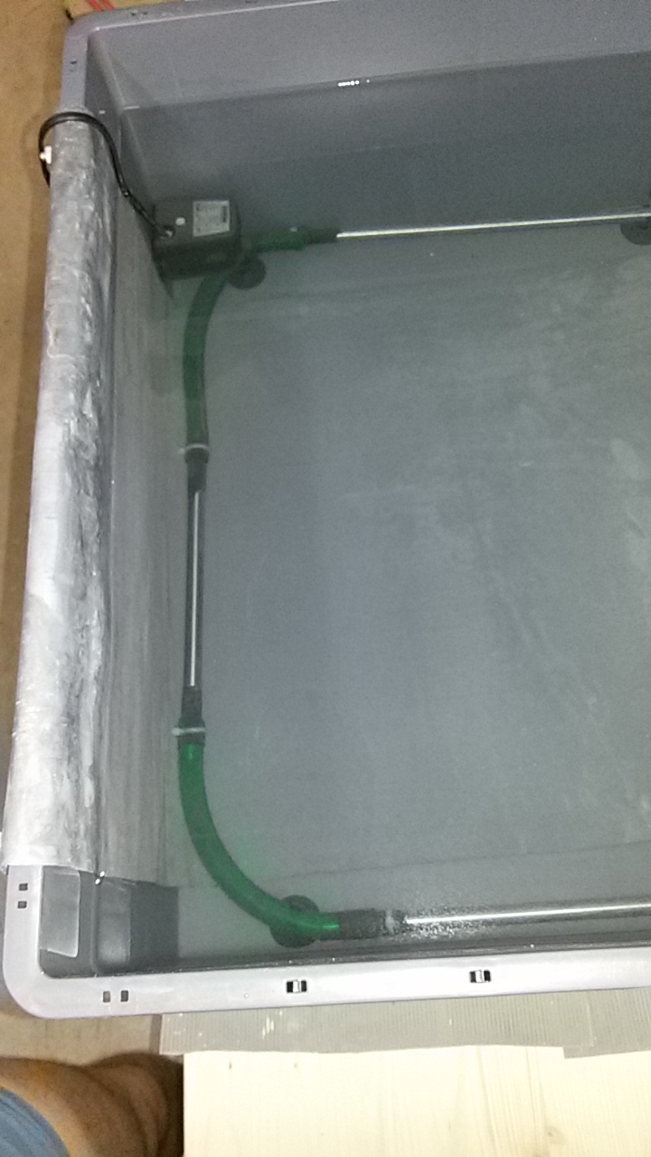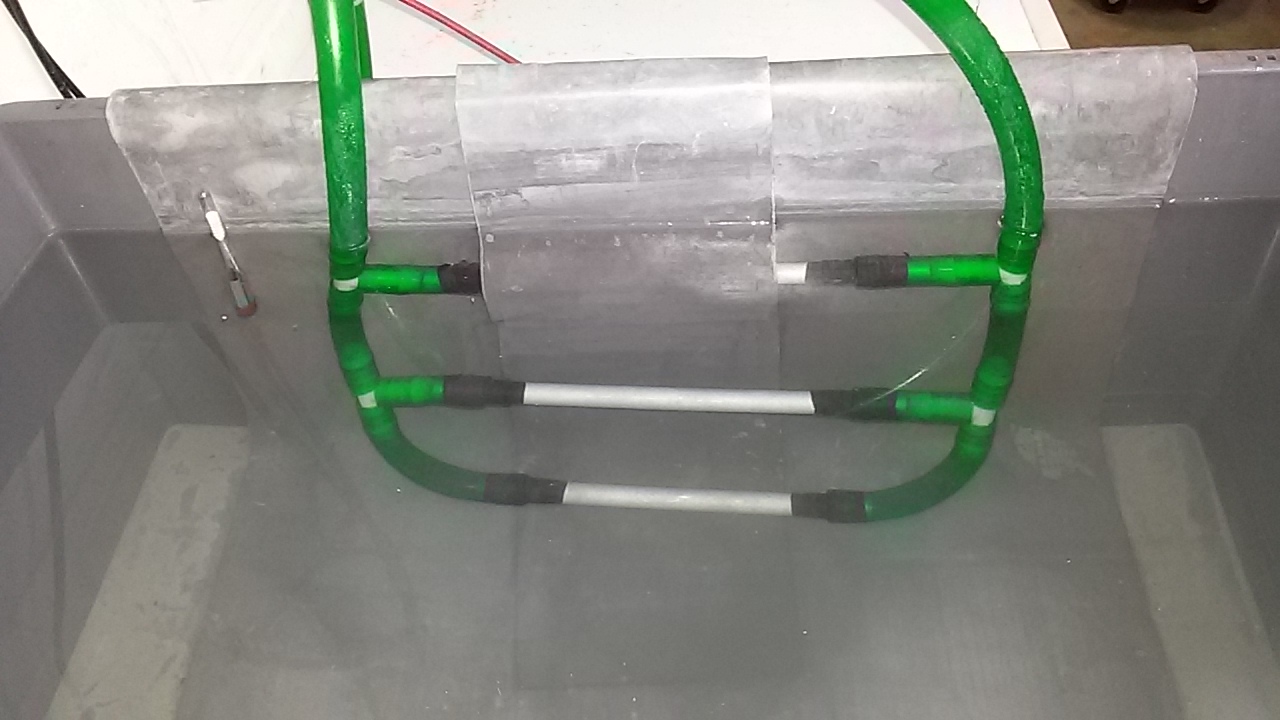 Wie auf dem Bild zu sehen, lasse ich im Moment noch 3 ca. 20cm lange Alu-Rohre mit kaltem Wasser durch laufen und habe die in das Eloxierbecken gehängt.