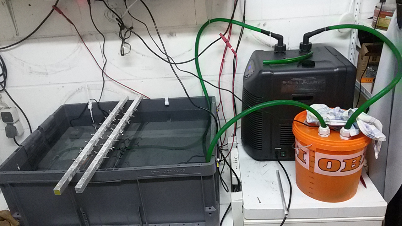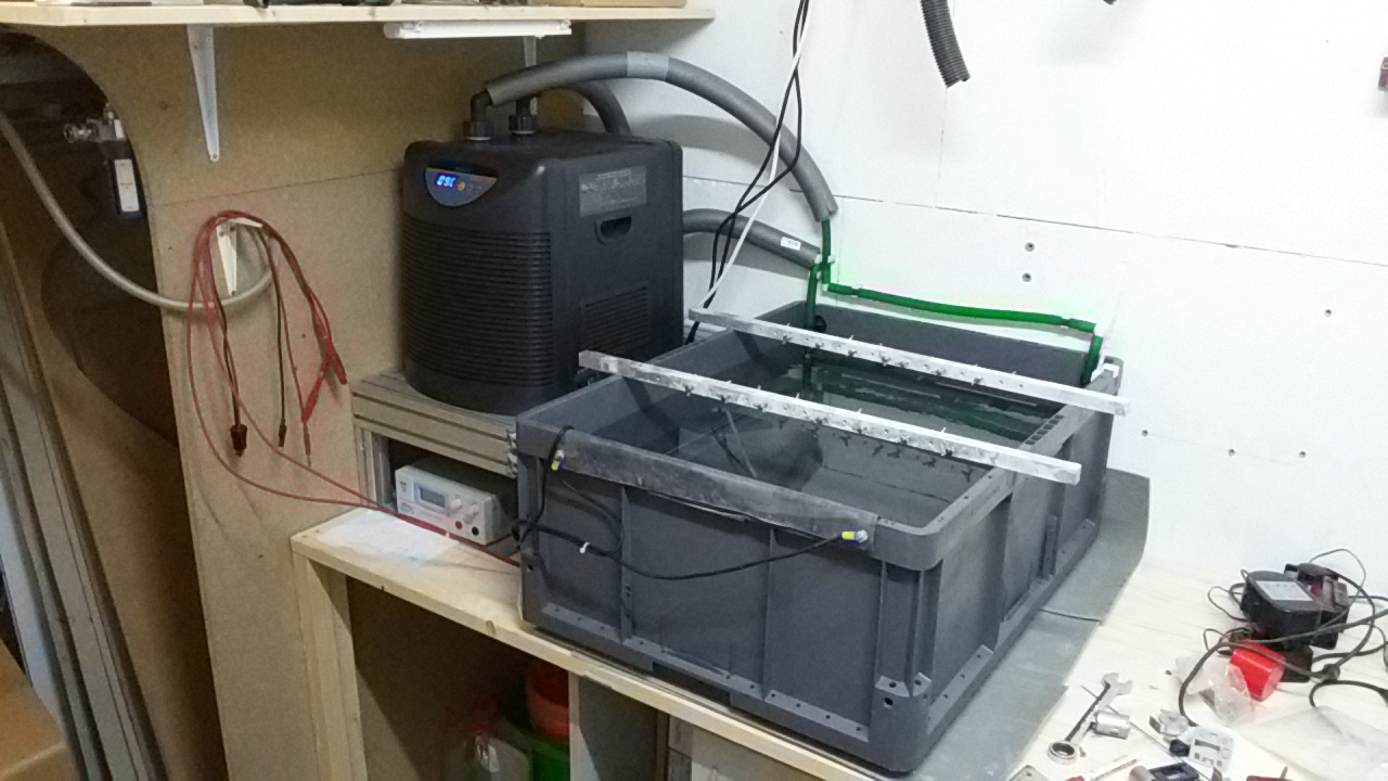 Grundsätzlich ist so ein Aufbau eine gute Idee, die man auch im semiprofessionellen Bereich anwenden kann: eine einfache Gefriertruhe wird mit einem passenden Tank/Kanister und Kühlmittel mit bspw. Kühlerfrostschutz versehen. Der Wärmetauscher befindet sich dann z.B. im Kanister und man pumpt den "heißen" Elektrolyt hindurch und danach wieder ins Bad.