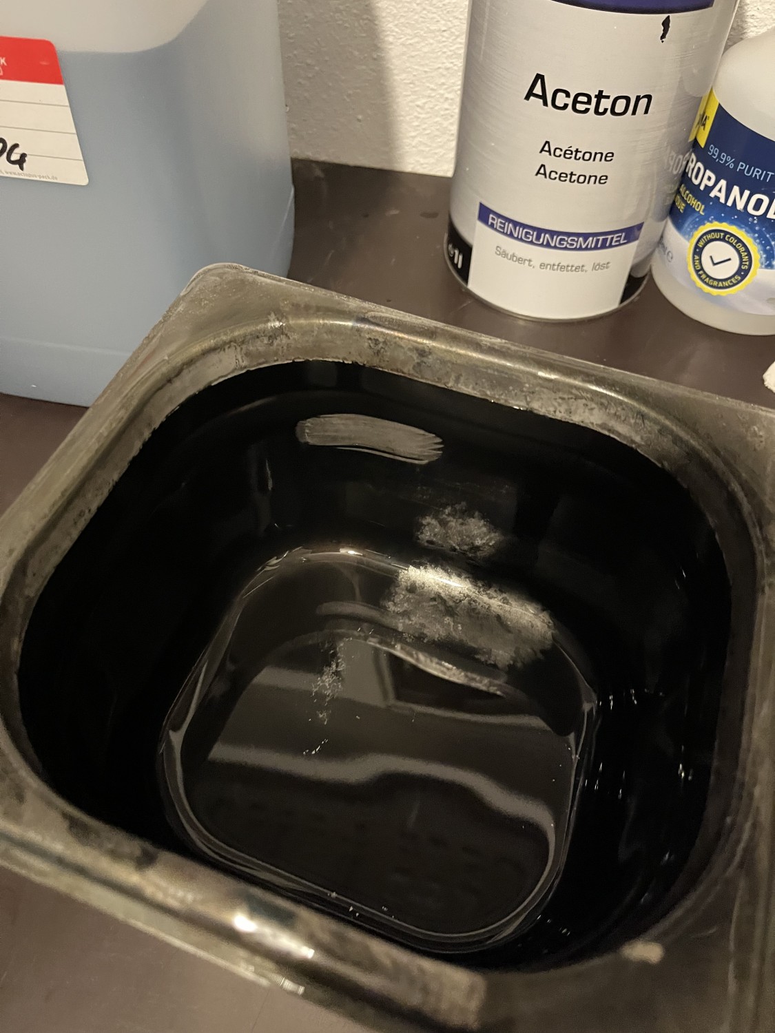 behälter -> nach Umfüllen des Bades in Kunststoffkanister (die Kanister mit der nun grauen Flüssigkeit sieht man im Hintergrund)