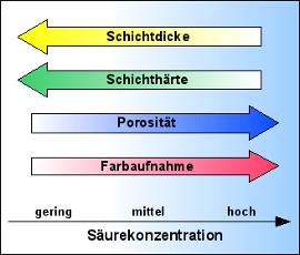 - je höher die Säurekonzentration ist, desto größer werden die Poren in der Schicht, desto langsamer wächst aber auch die Schicht und umso weicher wird sie.