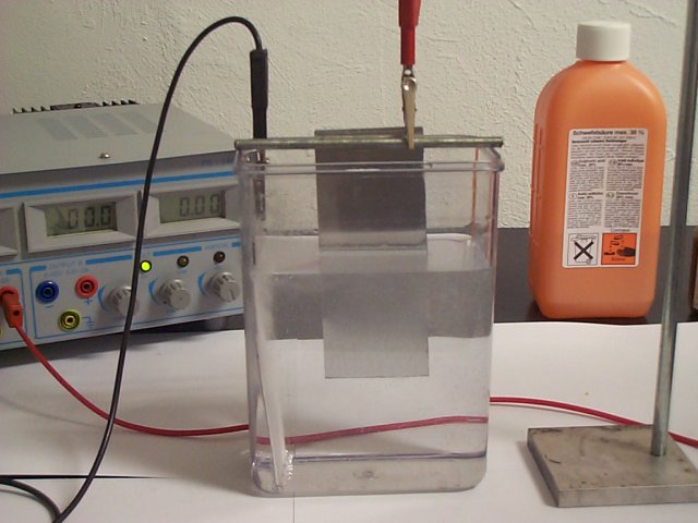 After about 45 minutes, the sheet has reached the desired layer thickness. Here you can clearly see the difference between the anodized and the original surface. Depending on the alloy and layer thickness, the results can vary.
