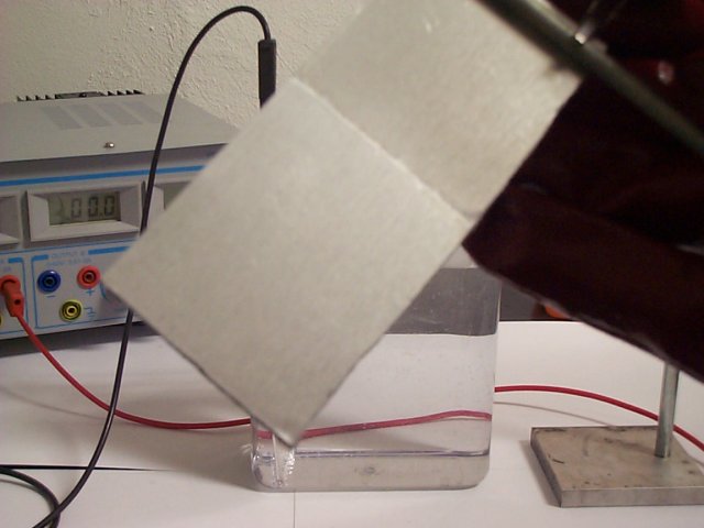The image shows a very simple setup: aluminum sheets were attached to two short aluminum rods using the crocodile clips of the power supply. On the left, the cathode plate is suspended across the bath, connected to the negative terminal. In the center, the aluminum sheet to be anodized hangs as the anode, connected to the positive terminal. If you look closely, you can see the “mist” of tiny hydrogen bubbles rising from the cathode. During this shot, the current was 1.0 ampere.