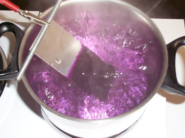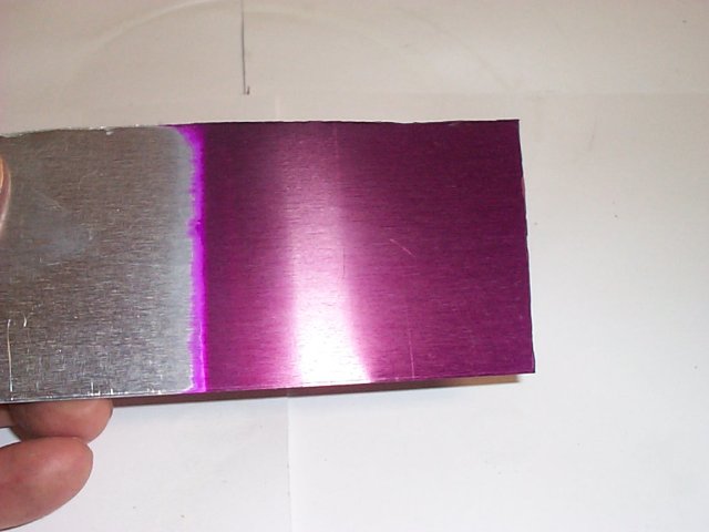 The dwell time in the bath depends on the shade, desired saturation, and color concentration. Here, the sheet was dyed for five minutes in a bath containing 3 grams of violet per liter, with gentle swaying of the sheet. By this point, it is already visible where anodizing occurred and where it did not: only the (hopefully formed) anodic layer absorbs the color – on the untreated upper part, the dye immediately beads off.