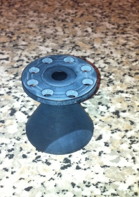 Dieses Werkstück bietet mit seinen acht Bohrungen ebensoviele Möglichkeiten, es durch Klemmung mittels Titanstab und 2 Titanmuttern ideal zu kontaktieren. Gewickelter Draht ist immer nur ein Manöver des letzten Augenblicks.