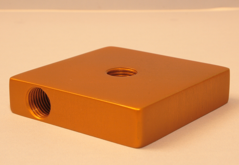 Die schwarzen Teile sind für mein Minibike. Ich habe sie 90 min. anodisiert und 5 min. gefärbt. Die orangenen Teile sind für eine Wasserkühlung eines PC's. Sie sind 30 min anodisiert und 30 min. gefärbt. Beim anodisieren hab ich festgestellt, das sich die Teile nach genau 30 min dunkel färben und somit aus dem orange ein dunkelbraun wird. Daher auch die kurze Anodisierzeit von nur 30 min. Leider kenne ich die Legierung nicht, es ist noch altes DDR-Material.