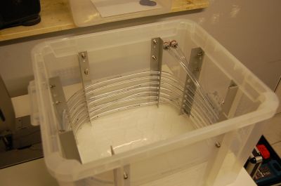 Nun zum Vorgang selbst. Anodisiert wird in einem halben Kunststoffkanister. Die Kathode ist ringförmig aus Al99,5 Blech.