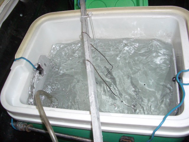 Der unverdünnte Scheibenfrostschutz und auch die Schwefelsäure werden im Gefrierschrank auf -15 bis -20 Grad heruntergekühlt. So brauchte ich bis jetzt noch keine aktive Kühlung und die Badtemperatur stieg nach 90 min. maximal auf +11 Grad.