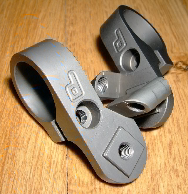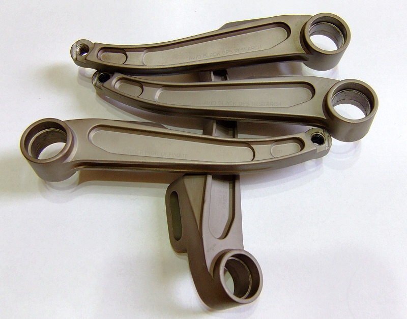 Die Teile wurden vorher mit Natronlauge entschichtet (die Reste der ursprünglichen violetten Eloxierung sieht man auf dem ersten Bild noch). Dieses Beizen sorgt für eine sehr ebene Oberfläche. (Tipp: das doppelte Anodisieren mit zwischenzeitlicher Entschichtung ist ein einfacher Trick, um blankere Oberflächen zu erzielen.)