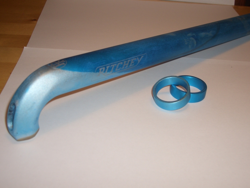 Nächstes Mal mit warmer Farblösung arbeiten (die wurde immer wieder kalt zwischendurch) und größere Gefäße (!), s. Sattelstütze (da sieht man rel. gut, dass sie 2 x halb/halb eloxiert und gefärbt wurde - kann man ja wieder). Die Teile habe ich im Durchschnitt ca. 25-30 mins hängen gehabt, die kleineren entsprechend kürzer.