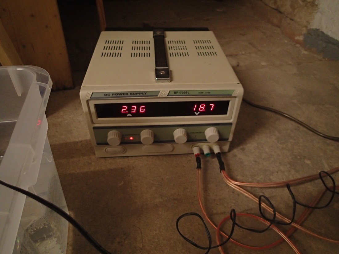 Das Problem ist, das die Spannung sich nicht einpendelt, sondern stetig steigt (pro Sekunde um ca. 0,1V), bis zur Maximalgrenze des Netzteiles (31V). Dann schaltet es um in den Spannungsquellenbetrieb. Beim Netzteil handelt es sich um diesen Kollegen: KLICK