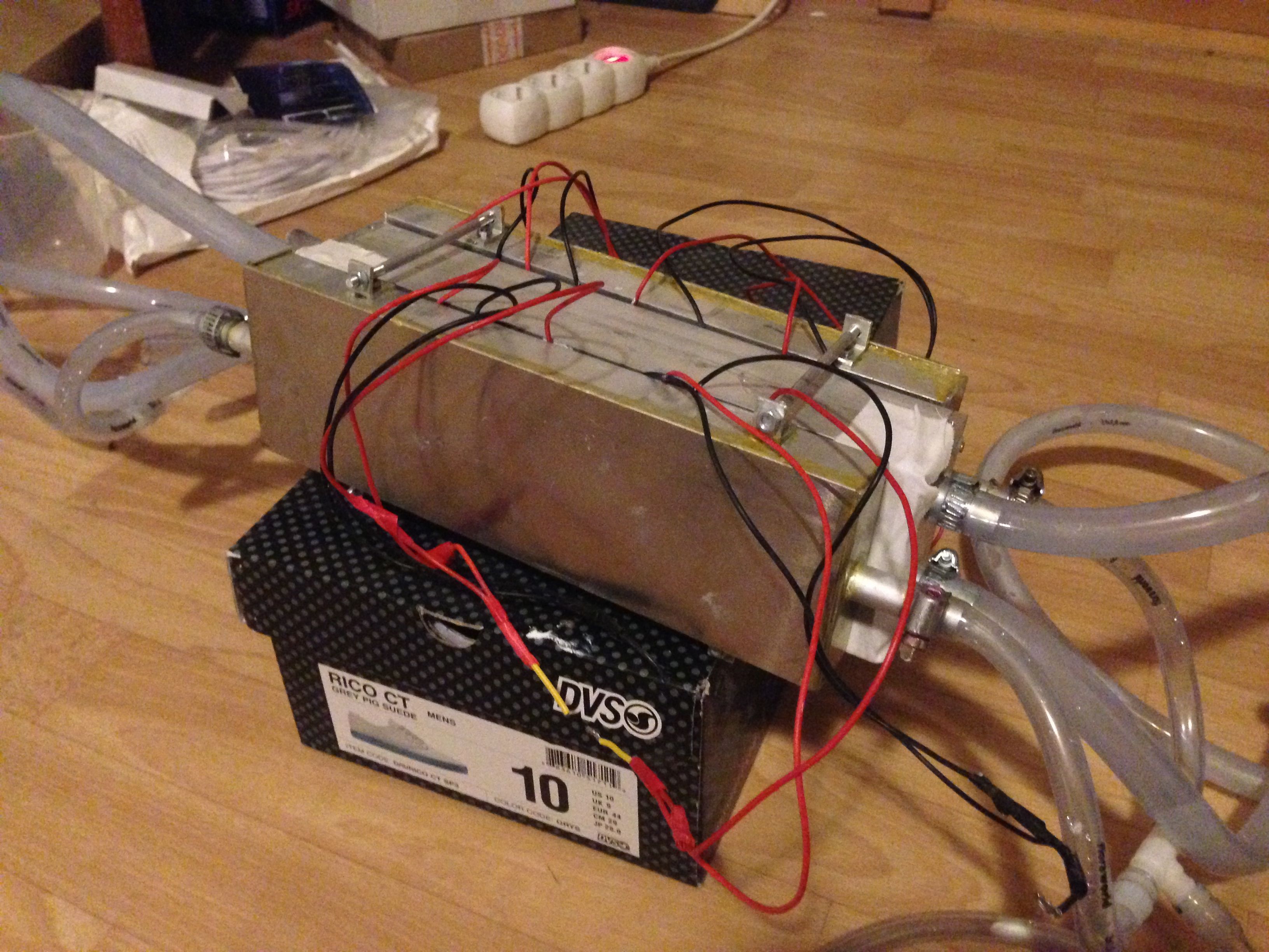 ich habe Alubleche passend zugeschnitten und mit den 2 anderen Kühlprofilen verklebt, dass alles dicht ist (mehr oder weniger...das hat noch Optimierpotential). An sich ist es das selbe Prinzip, wie mit den inneren Kühlrippen. Zwei Löcher gebohrt und Alurohre eingeklebt. Dann schließlich Schläuche mit Schlauchschellen verbunden und an eine zweite nicht so leistungsstarke Pumpe dran PUMPE .