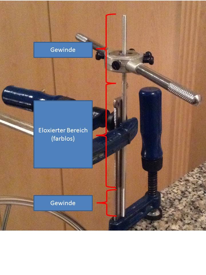 Ich es problematisch bereits eloxierte Teile im Eloxalbad zu haben. Hintergrund ist folgender. Ich bin sehr preiswert an eloxierte Aluminiumstangen gekommen und wollte diese durch Gewinde zur Kontaktierung meiner Werkstücke nutzen. Also oben und unten Gewinde reingeschnitten - an diesen Stellen habe ich dann das blanke Aluminium und die Kontaktierung ist sichergestellt. (siehe Bild)