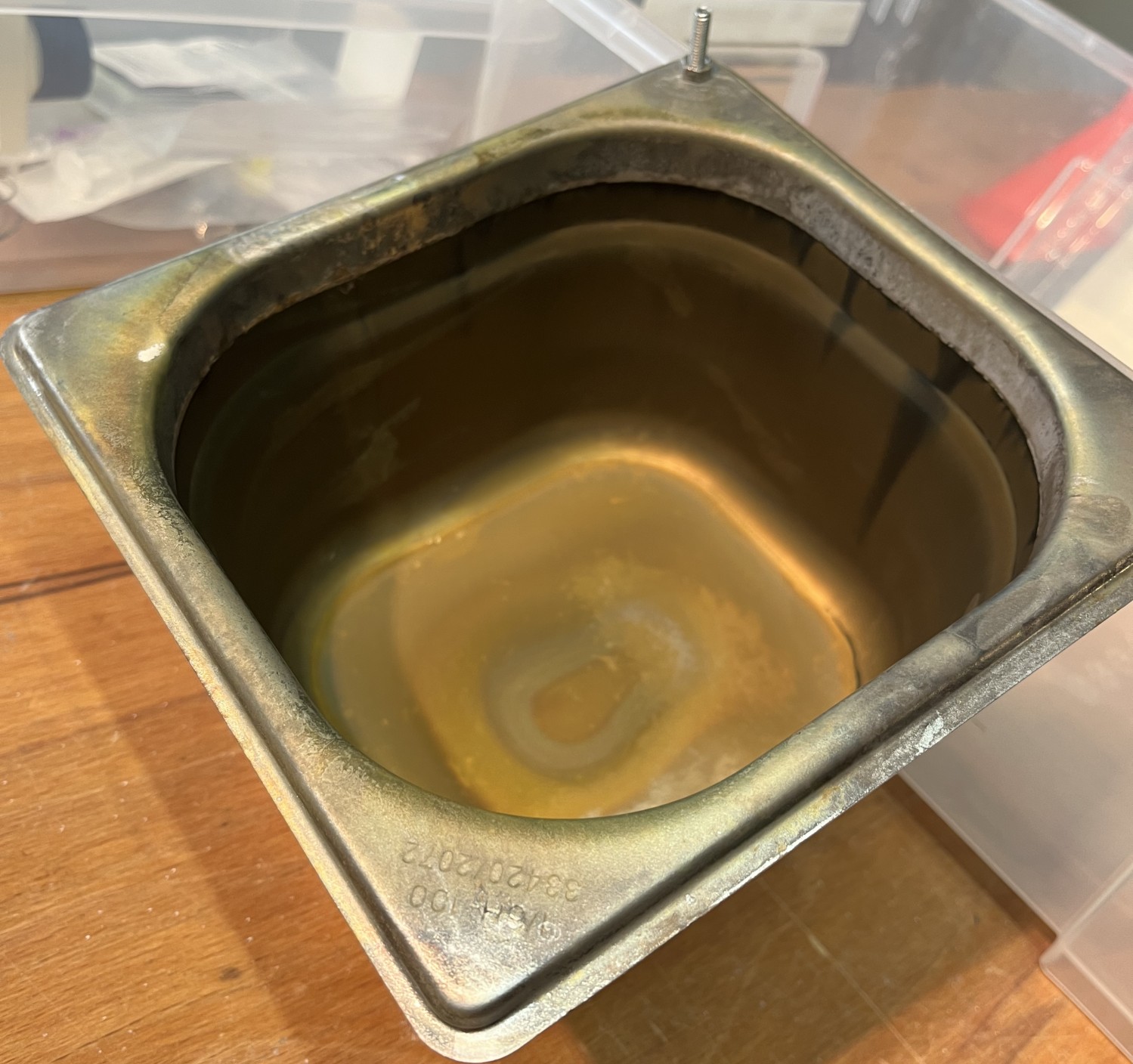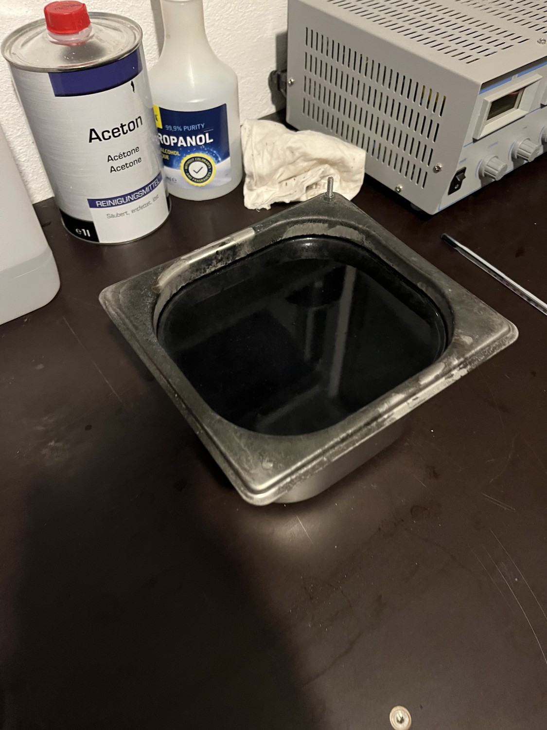 Grundsätzlich fand ich die Idee aus diesem Thread interessant den Gastrobehälter zu nutzen. Ich eloxiere nur Hobbyteile unterschiedlichster Größe, dies nur gelegentlich und baue jedes mal die Anlage auf/ab. Ansonsten sind die Flüssigkeiten in Kunststoff Kanistern gelagert.