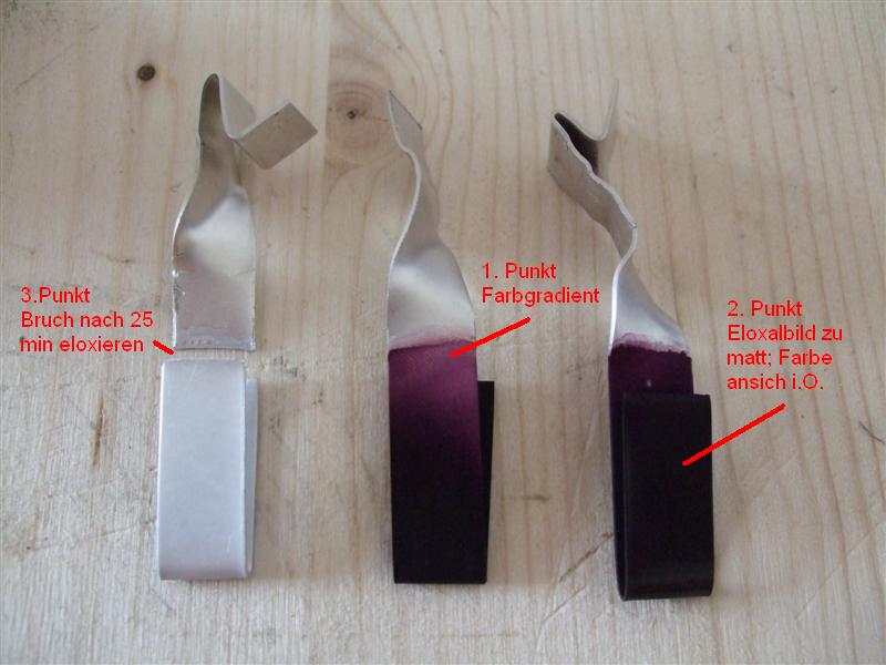 2. Bei Tests mit 10min 15 min 20min Badzeit entsteht ein mattes Eloxalbild ( wie anderes Forumsmitglied als alter ausgeblichener Lack auf alten Autos beschrieb)