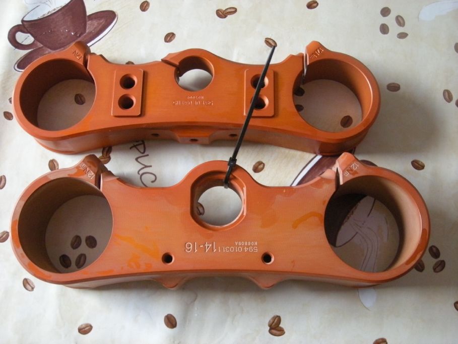 Könnte es sein, daß du die obere, kleinere Gabelbrücke zuerst und direkt danach die untere, größere Brücke eloxiert hast??