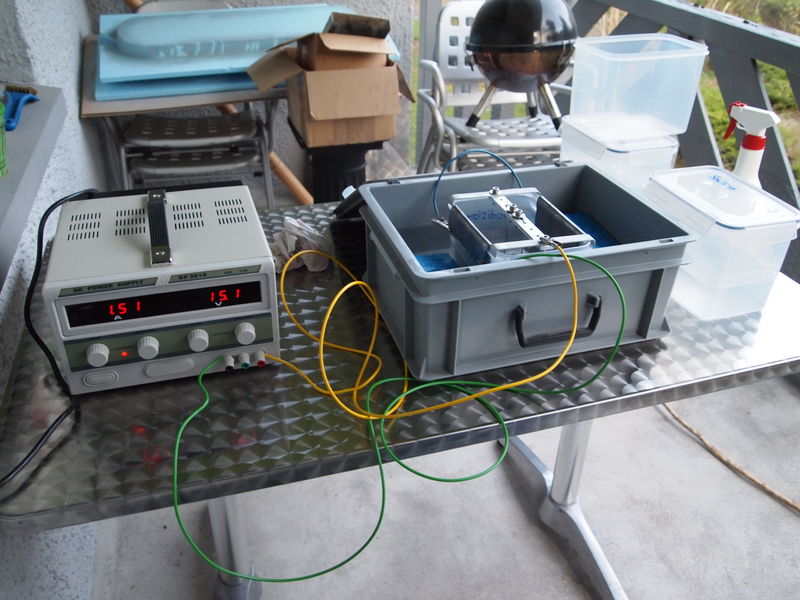 Das mit dem Verdampfen mag im Lehrbuch so stehen, trotzdem ist die Silikon Dichtung meines PP Säurebades nach ca. 3 Monaten regelrecht zerbröselt... Selbst die Dichtung des Behälters, in dem ich die Bleiplatten lagere, wird angegriffen. Anbei ein Bild der Behältnisse