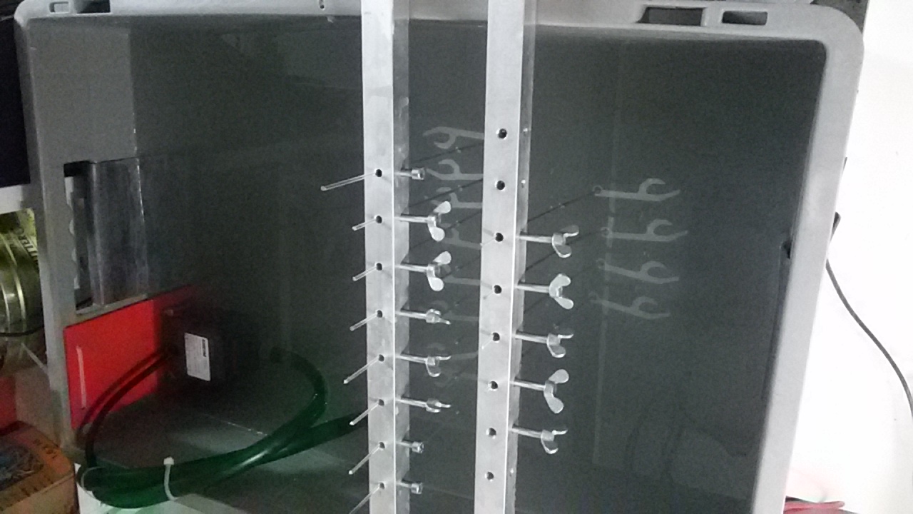 Auf dem 2ten Bild kann man erkennen wie die Flaschenöffner im Eloxierbad gehängt wurden.