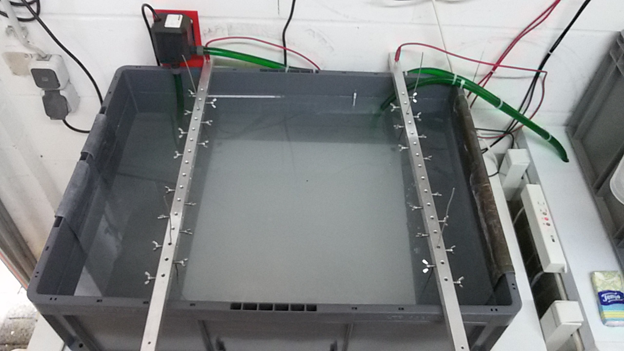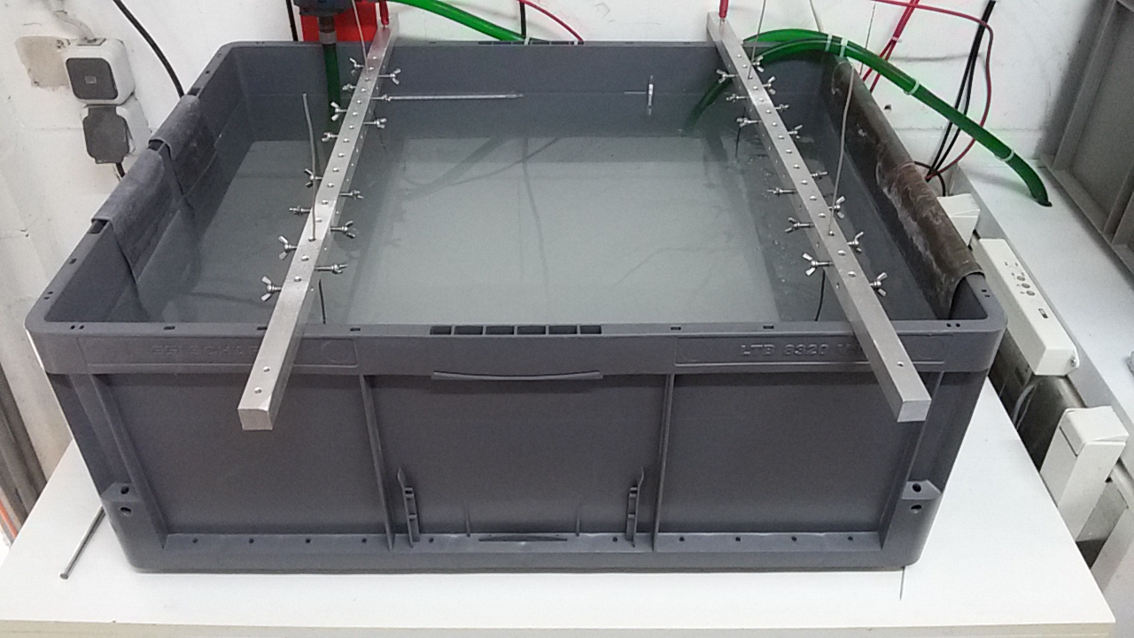 Wie auf dem Bild zu sehen, lasse ich im Moment noch 3 ca. 20cm lange Alu-Rohre mit kaltem Wasser durch laufen und habe die in das Eloxierbecken gehängt.