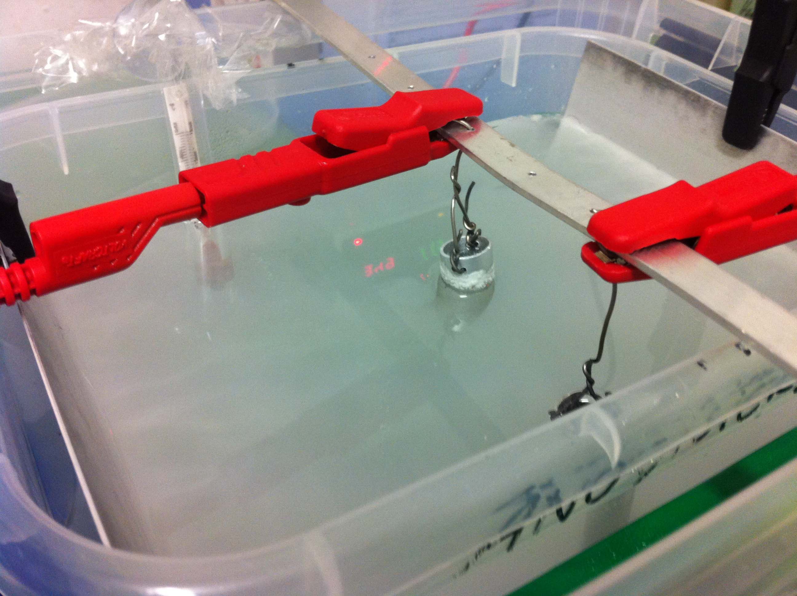 Anschließend in destillierten Wasser für einige Minuten eintauchen. Diese können selbstverständlich so lange im destillierten Wasser verweilen, bis sie in das Anodisier-Becken getaucht werden.