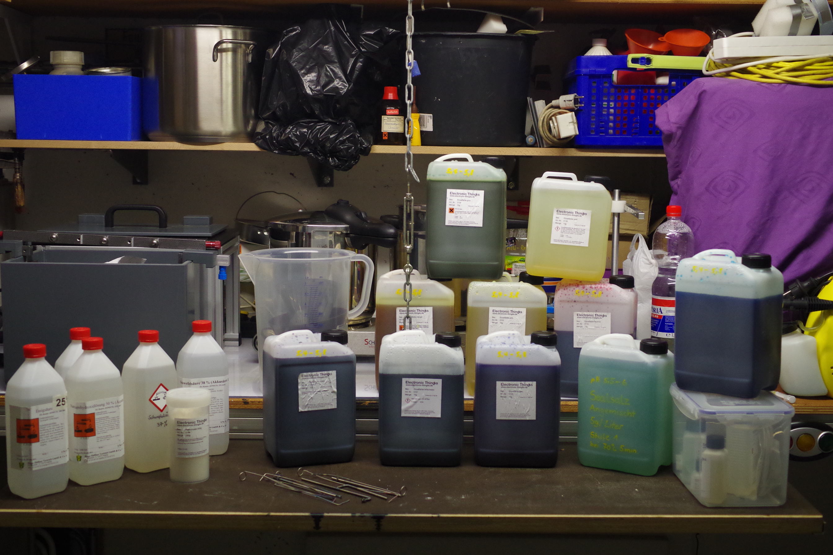 10x 3L Eloxalfarbe, pH-Wert mit pH-Meter und Temperaturüberwachung eingestellt, gepuffert und konserviert.